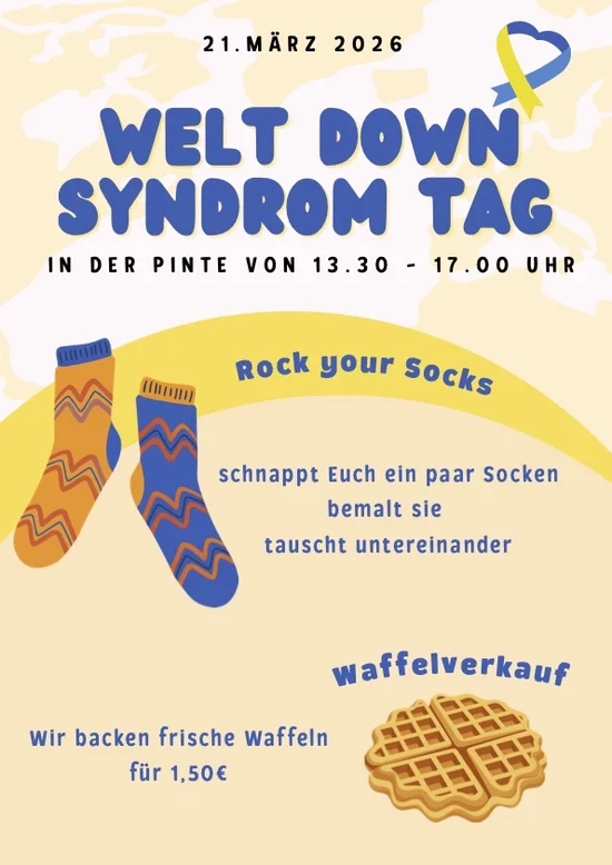 Am Samstag, dem 21.03.2026, findet in der Pintenzeit von 13:30 bis 17:00 Uhr eine Aktion zum Welt Down Syndrom Tag statt.
